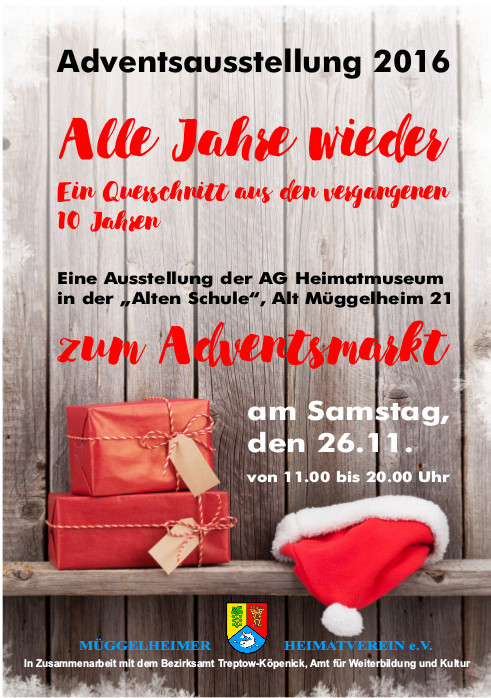 Eine Ausstellung der AG Heimatmuseum in der „Alten Schule“, Alt Müggelheim 21 zum Adventsmarkt am Samstag, den 26.11.2016 von 11.00 bis 20.00 Uhr