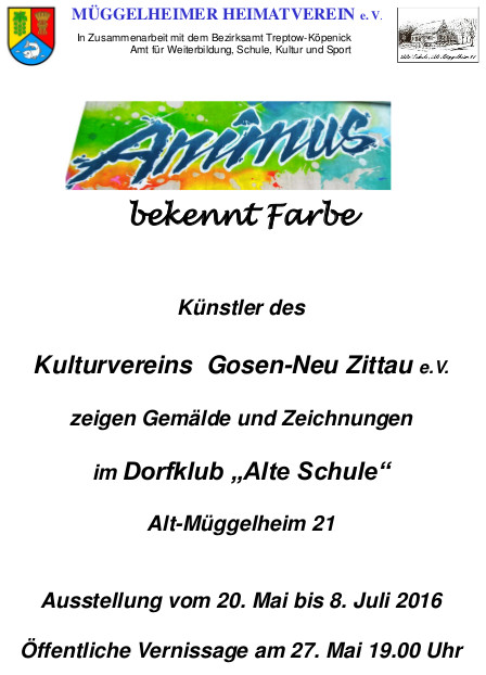 Künstler des Kulturvereins Gosen-Neu Zittau e.V. zeigen Gemälde und Zeichnungen im Dorfklub „Alte Schule“ Alt-Müggelheim 21 Ausstellung vom 20. Mai bis 8. Juli 2016 Öffentliche Vernissage am 27. Mai 19.00 Uhr
