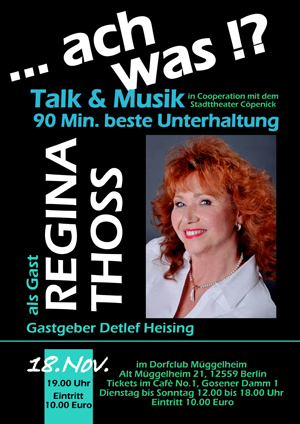 Am 18. November um 19:00 UHr gitb es im Dorfklub Müggelheim beste Unterhaltung mit dem Gastgeber Detlef Heising und Regina Thoss in Kooperation mit dem Stadttheater Köpenick.