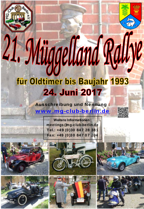 Am 24.06.2017 findet zum 21. Mal die Müggelland Rallye statt. Sie wird vom MG-Club Berlin veranstaltet und der Müggelheimer Heimatverein und die Helfer werden die Veranstaltung unterstützen.
