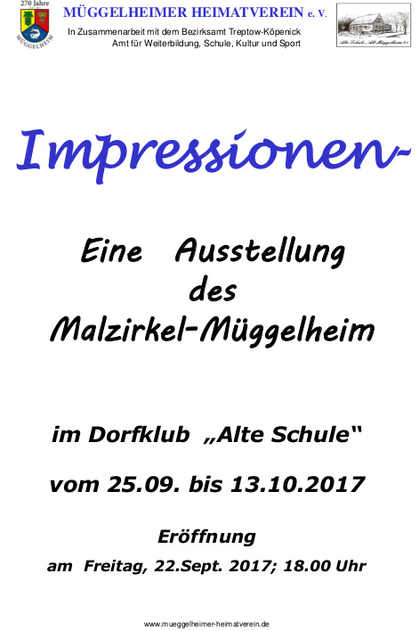 Die Veranstaltung findet am 27.10.2017 um 18:00 Uhr im Dorfklub - Alte Schule Alt-Müggelheim 21 in 12559 Müggelheim statt.