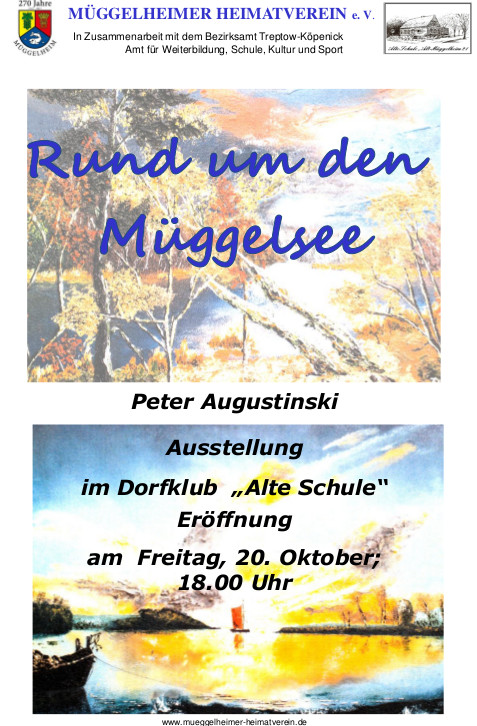 Eine Ausstellung mit Gemälden von Peter Augustinski zum Thema 'Rund um den Müggelsee'. Die Ausstellung ist mehrere Wochen im Dorfklub zu seheng.