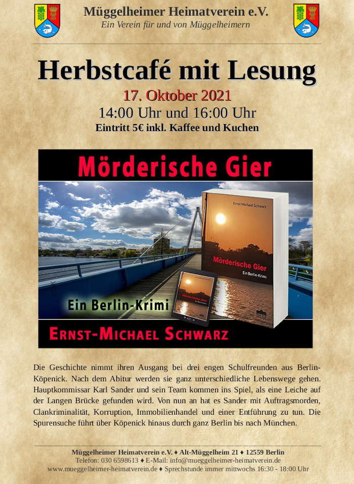 Lesung aus dem neuen Berlin-Krimi “Mörderische Gier” von Herrn Ernst-Michael Schwarz bei Kaffee und Kuchen.