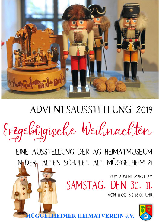 In diesem Jahr möchten wir gerne Erzgebirgische Weihnachten vorstellen, von Räuchermännchen über Pyramiden, Nussknacker, Engel, Klöppelarbeiten, Bücher, Musik usw. Wir präsentieren Ihre Schätze zum Adventsmarkt, am 30. November 2019 von 11 Uhr bis 18 Uhr in der Alten Schule.